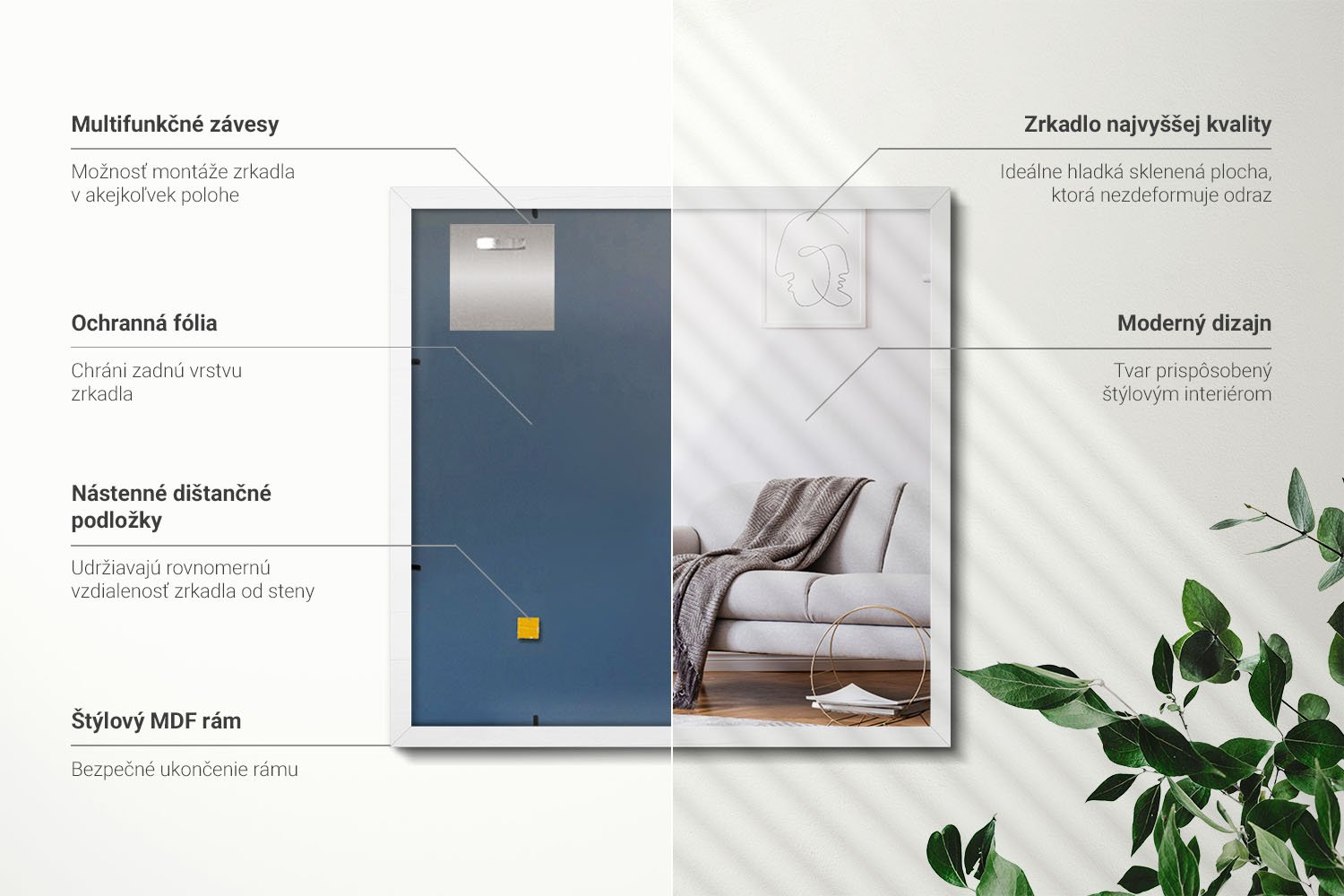 Zrkadlo je dostupné v obdĺžnikovom aj štvorcovom tvare a jeho biely rám dodáva interiéru svieži, vzdušný vzhľad. Skvele zapadne do klasických, moderných aj škandinávskych interiérov, kde vynikne svojou jednoduchosťou a eleganciou.